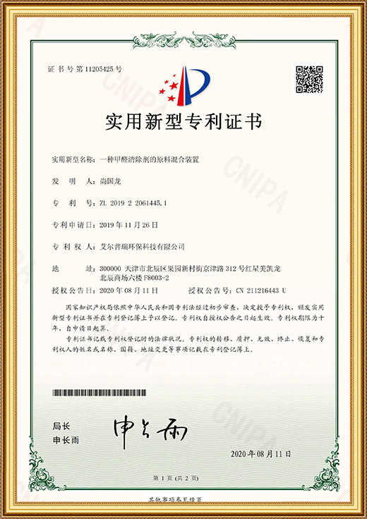 實(shí)用新型專利證書(一種甲醛清除劑的原料混合