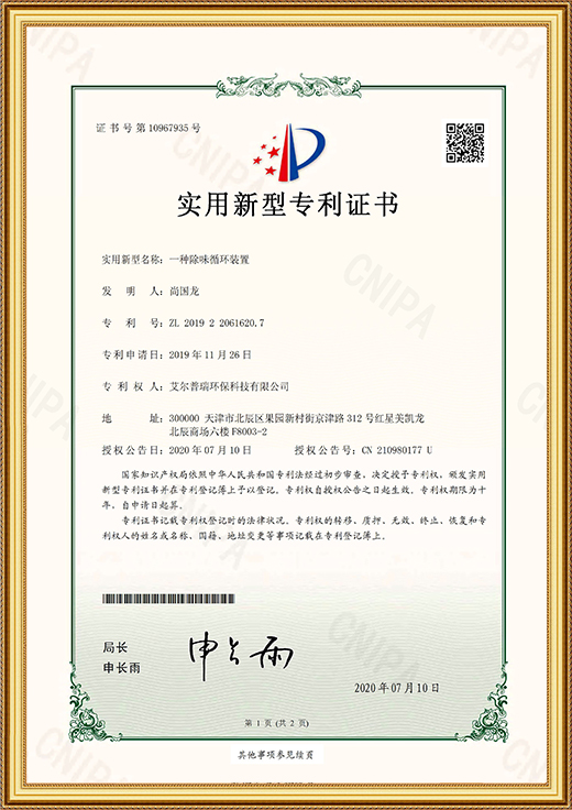 實(shí)用新型專利證書(一種除味循環(huán)裝置)